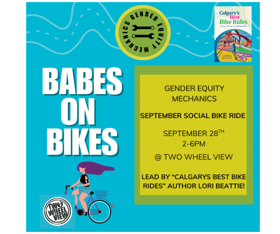 Calling all the women out there! Babes on Bikes is part of the GEM (gender equity mechanics) program at Two Wheel View. Join Lori and Two Wheel View for this FREE community bike event where Lori will lead you on a ride from her book, Calgary’s Best Bike Rides, and we’ll all enjoy some post-ride snacks at the Two Wheel View headquarters. You can also buy signed copies of her books, Calgary’s Best Walks and Calgary’s Best Bike Rides!
