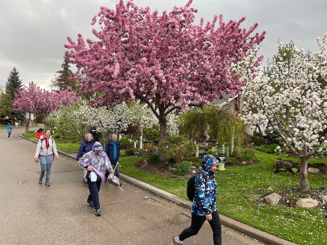 We’ll walk along neighhourhood streets past blossoming cherry trees and beautiful homes, along the Elbow River Pathway to hidden stairways and pathways that lead to spectacular views.